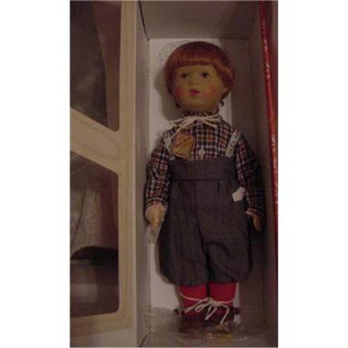 13" Kathe Kruse Boy Doll, Tobias, made in Germany. He has red hair, and light brown eyes with orangish highlights. He has his wrist tag, and his box. The box is has a hinge type top and see thru window. Made in Germany. Smoke Free Home.