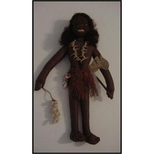She has her cloth tag on the slip. Straw shoes with some wear. She is all original but does have surface soil and dirty face. Have not tired to clean her as I am not sure what you would use. There are no holes to the hands. 13" Cloth doll, made in Australia for Kimport Dolls. Cloth label on back of doll. Painted features, coarse black hair, grass skirt, shell necklace and decorations. Still has the paper tag on wrist, Reg. 71899 Trade Mark "The SARAH MIDGLEY BUDGERREE DOLL" Copyright 15775. How great is that to still have the wrist tag? The only problem is the grass skirt material has fallen apart on the backside. It is just old natural material that is brittle and falling apart. <P><P>Shipping is $15, covers shipping, handling and insurance in the USA.