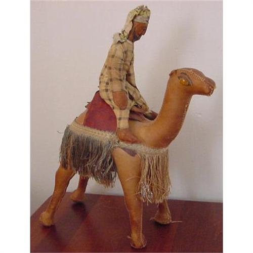 Wonderful 7.5" man made of leather with painted features, riding a leather camel. Am sure it is old, probably from the 1940s. There is some aging on the clothes, and there is a little wear on the camel but over all very good condition. The camel measures 12" tall. <P><P>Email with questions.