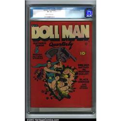 Doll Man Quarterly #1 (Quality, 1941). After appearing in Feature Comics for almost two years, Doll Man made his solo debut in this issue, and would continue in both series' throughout the 1940s. Doll Man has benefited from strong collector interest over the years thanks to his talented stable of artists, including Lou Fine, Reed Crandall and Dick Powell. This copy is very attractive, displaying only minor defects which hardly detract from the stunning nature of this highly desirable book. This beautiful Doll Man Quarterly is the highest-graded CGC graded unrestored copy to date. CGC VF- 7.5 Cream to off-white pages. Overstreet 2001 FN 6.0 value = $915; NM 9.4 value = $3,200. Important notice: We expect to be auctioning lots at the rate of 200-250 per hour. Sometimes eBay Premier live bid software cannot keep up with that pace, so we strongly recommend that you place a realistic proxy bid now as insurance to avoid disappointment. Also please note that all Heritage/CAA lots purchased through eBay Premier carry a 20% Buyer's Premium.