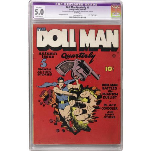 <B>Doll Man Quarterly #1 (Quality, 1941) CGC Apparent VG/FN 5.0 Moderate (P) White pages.</B></I> First issue for the mite from <B>Feature Comics</B></I>. Justin Wright backup feature. CGC notes, "Restoration includes: color touch, tear seals, spine split sealed, reinforced." Overstreet 2006 GD 2.0 value = $323; VG 4.0 value = $646; FN 6.0 value = $969.<BR><BR><b>Shipping:</b> Slabbed Comic (<a target="_blank" href="http://www.heritageauctions.com/common/shipping.php">view shipping information</a>)