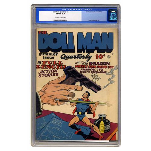 <B>Doll Man Quarterly #3 (Quality, 1942) CGC VF/NM 9.0 Off-white to white pages.</B></I> Much about the Doll Man reminds us of DC's Silver Age Atom of later years; perhaps this character inspired the later one in some way. Fred Guardineer is among the issue's interior artists; the cover looks like the work of Quality editor Gill Fox. Overstreet 2005 VF/NM 9.0 value = $853; NM- 9.2 value = $1,150. CGC census 12/05: 1 in 9.0, none higher.