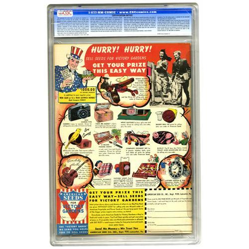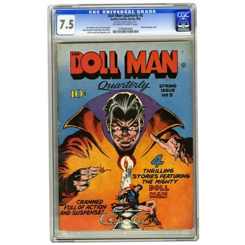 <B>Doll Man Quarterly #5 (Quality, 1943) CGC VF- 7.5 Off-white to white pages.</B></I> A six-inch hero is a cover artist's dream come true, and Al Bryant outdid himself here with one of the best covers of this title's run! CGC notes, "Very minor amount of glue on cover." Overstreet 2006 VF 8.0 value = $488. CGC census 3/06: 1 in 7.5, 1 higher.