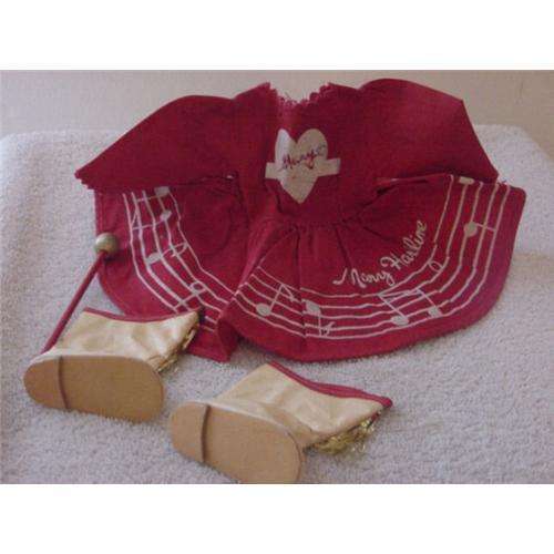 Mary Hartline outfit for the 1950s 16" size hard plastic doll. This is from the 1950s not a remake. Red cotton with red cotton attached slip, no underpants. The name MARY HARTLINE is on the skirt with the music notes and the name MARY is on the bodice, it shows some wear. There is a little tear on the back right side at the waist, it can probably be restitched so as not see see it, it is right at the waist line. Has both buttons. You also get a pair of boots and a baton.