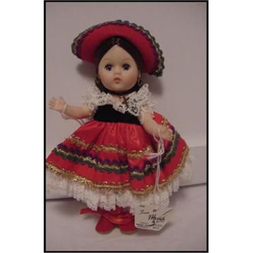Cute 8" vinyl Ginny, she represents MEXICO, from the FAR AWAY LANDS series, she is made of vinyl, has open and close sleep eyes, jointed at the head, shoulders and hips, has a paper Wrist Tag that identifies her as MEXICO. All original, doesn't look like she was played with. Cross necklace and hoop earrings. Faint green around earrings.