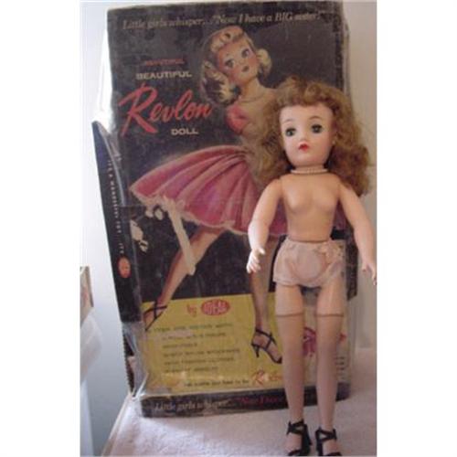 17.5" vinyl Miss Revlon, number 0940 KISSING PINK, dress is tagged and comes with the Miss Revlon booklet. Box has been covered and is not great. Doll is missing her earrings and has green on the ears. Elastic is stretched inthe hi heels and the slip needs to be restitched at the waist. Dress is wonderful and a rare dress for Miss Revlon. Made by Ideal Doll Co. in the 1960s. <P><P>Got questions, email before you bid.