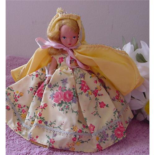 5.5" hard plastic pinched face painted eyes Nancy Ann Storybook Doll. She has moveable head, arms and legs. She is Rain Rain Go Away. Very sweet in yellow taffeta cape and yellow floral print dress. Made by The Nancy Ann Storybook Doll Co. in the 1950s.<P><P>Got questions, email before you bid.
