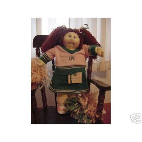 Here is AUTUMN, A kid for all Seasons. She is an original Cabbage Patch Soft Sculpt Doll by Xavier Roberts. She is dated 1985 on the stamp on her rear and on name card attached to her skirt. She has green eyes and reddish brown hair, the hair is done in two pigtails. All original the way she came from the hospital. Darling Cheerleader outfit with knitted pink and green top with the CPK letters on chest, green skirt trimmed in pink and green knit panties. Darling pink socks and pink and white saddle shoes. She has two paper pompoms, the elastic rubberband has broken so she can't hold it now but you could replace the band. A great coordinating outfit to go with her green eyes and reddish brown hair. I guess this is an illegal adoption as I don't have any of her papers, she was sold at an auction from a lady's collection and there was no paperwork offered.