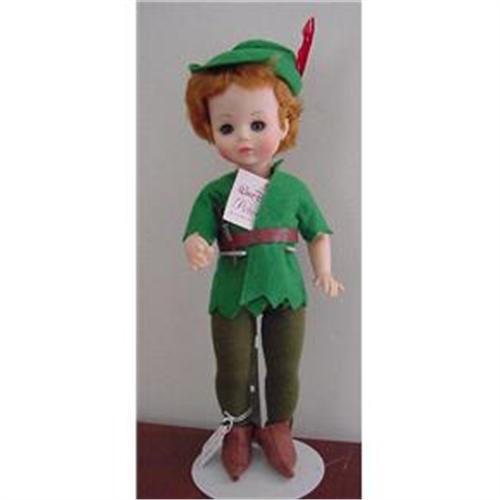 14" Peter Pan by Madame Alexander Walt Disney copyright. This doll has never been played with, has the red feather in hat, knife on belt at waist. Wrist tag has been taken off but is there. Tagged PETER PAN Madame Alexander . A wonderful Disney item to add to any collection. Bright color and not fading or holes. Beautiful face color on vinyl.