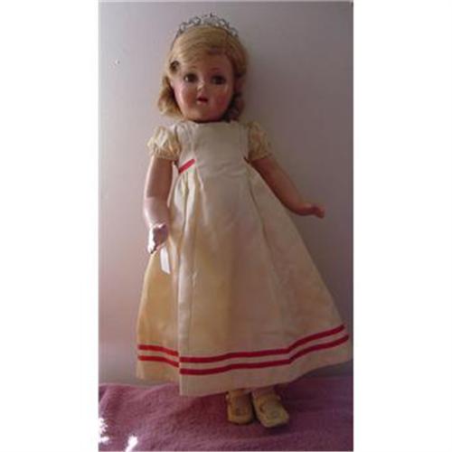23" composition Madame Alexander PRINCESS ELIZABETH, all original outfit is tagged PRINCESS ELIZABETH Madame Alexander. The outfit has never been off the doll, there is some discoloration on the back of the dress. Sorry to say the doll has some problems, cloudy eyes, couple of lines coming from the right eye, and and a light one from the left eye, she must have fallen and landed on her lip and nose as there is some damage, she is split in the crotch and has about a two inch crack line on each sie of the torso coming from the leg opening, it is not split open but just cracked. The sole is missing from the right shoe and the bottom is coming loose from the shoe material. The doll has nice coloring and would still display nicely, she is a large size. <P><P>Got questions, email before you bid.