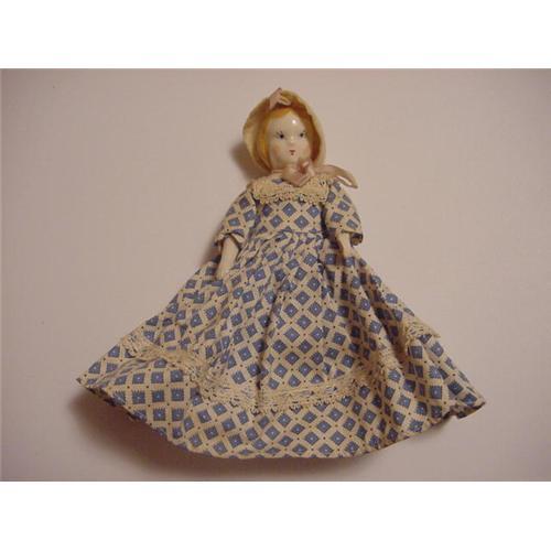 7" Ruth Gibbs China Doll, she has a white china head, arms and legs, body is white cloth. She has the blonde hair, with gold slippers. Original cotton print dress with lace, you might want to wash it but I didn't. It does have the paper label glued inside the back hem like Ruth Gibbs did, it says Precious Little Lady PLAY FRIEND No. 405P Ruth Gibbs, Inc., Flemington, N.J.