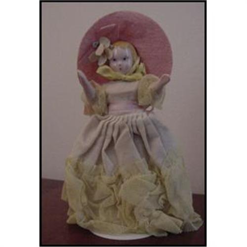7" Ruth Gibbs Godey Lady China Doll, china shoulder plate marked RG on back, china arms and legs. Pink China parts, white cotton body. Gold dipped slippers. Original Outfit.