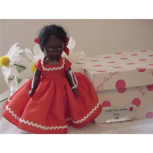 5.5" hard plastic Nancy Ann Storybook doll TOPSY. Red taffeta dress with white rickrack. Red ribbon in hair. White slip sewn in at waist and white pantaloons. Dress has the snap on the back. Black open and close follow me eyes. Does comes with a box that has label. FAIRYTALE SERIES TOPSY #126, water spotting on lid and split on one corner. <P><P>Got questions, email before you bid.