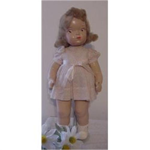 16" Terri Lee Composition Doll. This is the first doll The Terri Lee Doll Company made in the late 1940s. She has the mannequin wig, has not had anything done to it. She does have crazing on the face and some of the paint is missing from her eyes. Around the left ear there is cracking of the composition. There are no seam separations on the head. She has the hole in the hand for the trademark daisy. Some paint chipping around it. She has some cracking on the legs and some on the body but over all not has bad as alot of composition Terri Lees. She is wearing her original early LOOPY TAG pink dotted swiss dress. Her also has her rayon slip and underwear. Oil cloth shoes but missing one ribbon and replaced rayon socks.