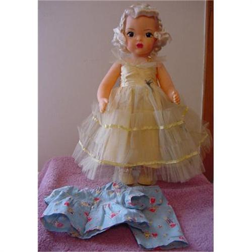 16" Terri Lee doll, marked Terri Lee on the back of the torso, made in the 1950s. Original platinum raysheen wig. Yellow formal is tagged,in great condition, missing the flower on the top of the stems at the waist. Pajamas are played with, some stains on them. Both formal and pajamas are tagged. Doll is wearing replaced underwear and shoes. Smoke Free Home.