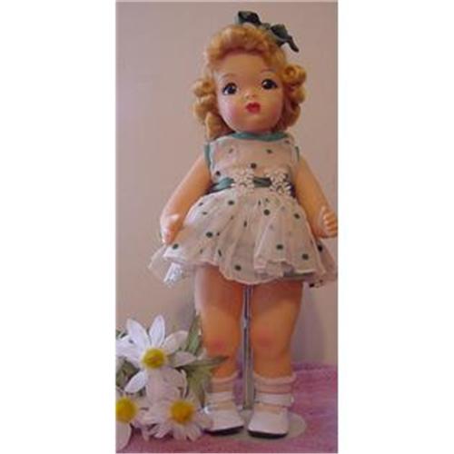 16" hard plastic Terri Lee from the 1950s with original raysheen wig, still in original set, wearing tagged Irish Coin Dot Dress, has the slip with green ribbon trim. The sash is a replaced green ribbon. The doll is marked Terri Lee on the back, no cracks, stains or unwanted smells.<P><P>Got questions, email before you bid.