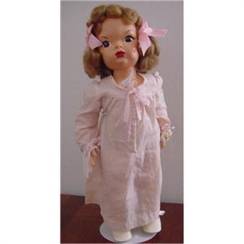 She is a beautiful doll, is wearing her original LOOPY TAG pink nightgown. The sleeves have pink ribbons tied at the wrist. And she wears her original daisy flower on her left wrist. She has Terri Lee panties and white now cream colored oil cloth shoes. No smells, cracks, splits, stains, etc.