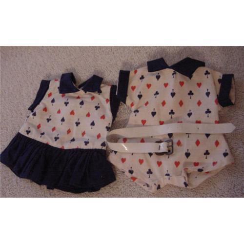 10" Tiny Terri Lee and Tiny Jerri Lee Card Print outfits. Tiny Terri dress is tagged. Tiny Jerri Romper comes with belt. You might want to freshen up the outfits, white is a tad dingy. Great for your dolls.