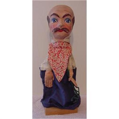 13" WPA hand puppet, papier mache head, comes stamped with the WPA PENN stamp. Comes on a wooden stand.