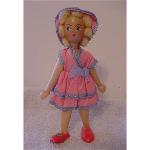 7" Wooden doll made in Poland. Dressed in pink with blue trim. Painted features, moveable arms and legs. Has a Made in Poland sticker on shoe. <P><P>Got questions, email before you bid.