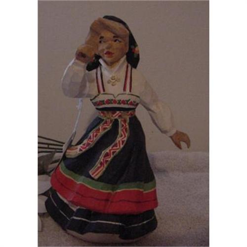 8" Made in Norway, wooden figure. Marked on bottom, "carved by hand in Norway." There is a hole in the and she is holding up but nothing in it. There is a crack in the wood on the bottom of the skirt, going down to base about 1" long. <P><P>Got questions, email before you bid.