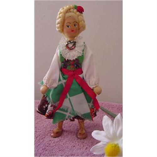 9" wooden doll Made in Poland, she has moveable arms and legs with painted features. Probably represents an international ethnic costume.