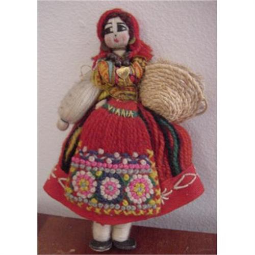 5.25" yarn made doll, most likely made in Portugal but no tag. Hs VIANIA stitched on apron. Yarn is a little dirty. One shoe is missing the sole. Very dainty little doll.