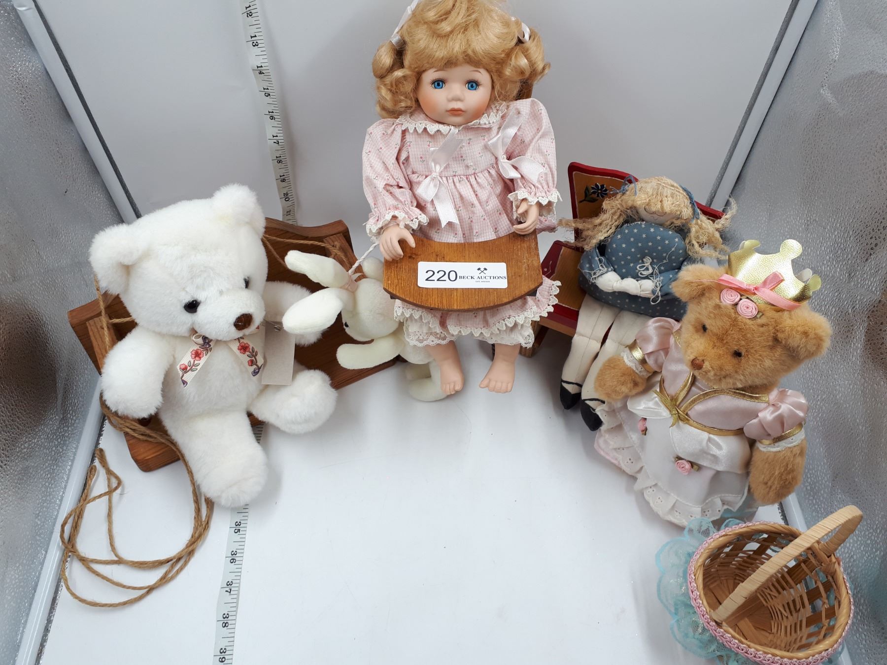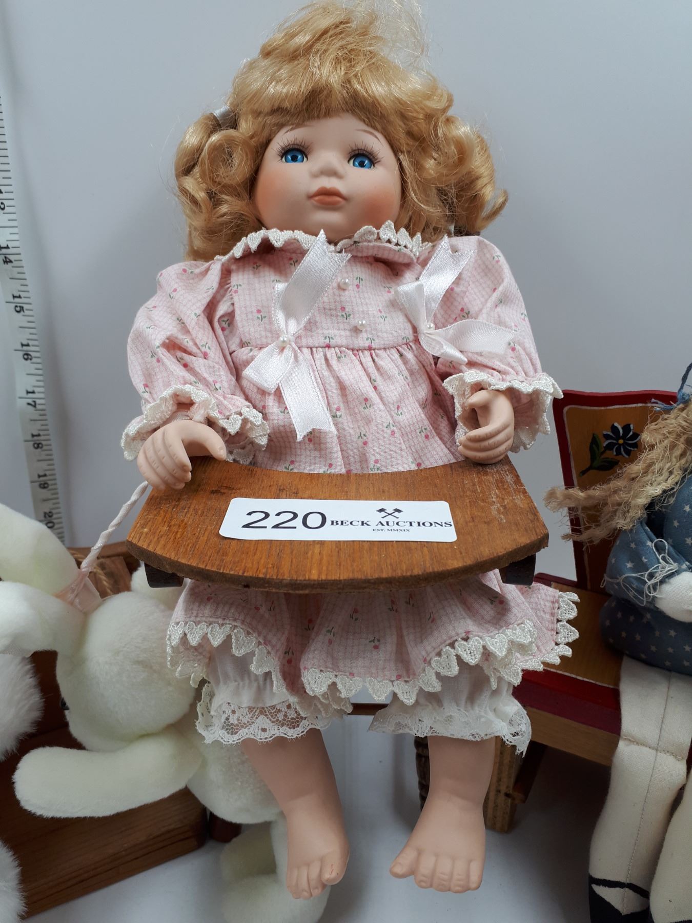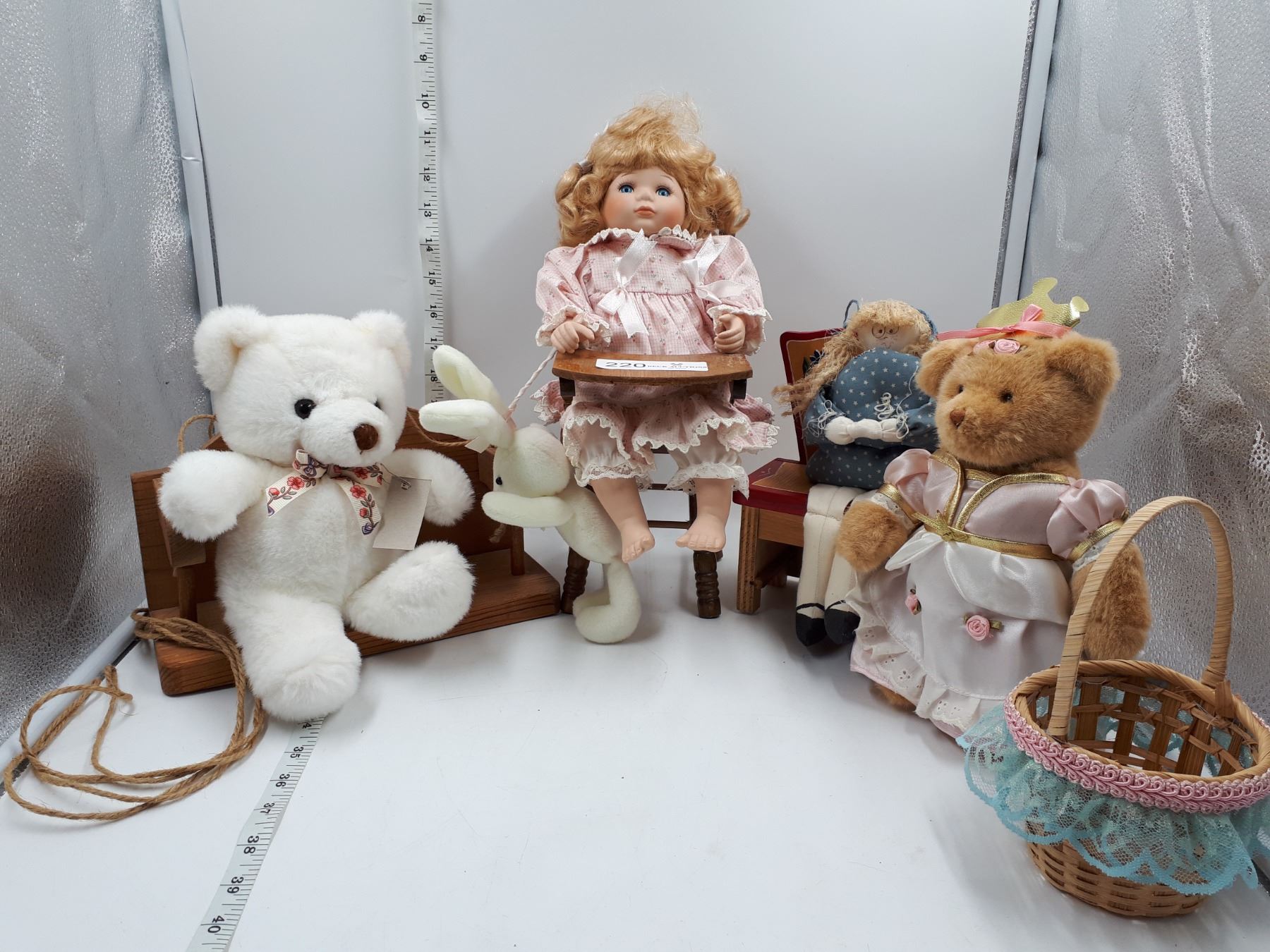 Lot of two teddies, a porcelain doll in highchair, doll wood swing, etc. all in good previously loved condition.