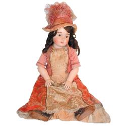 Doll, bisque head marked 16, open mouth, sleep eyes, jointed composition body, elaborate Victorian dress & hat, costume in Fair condition, doll in VG condition, 28"H.