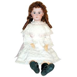Doll, bisque head marked 1907-16, probably by Theodor Recknagel, open mouth, dimpled chin, pierced ears, jointed composition body, nicely dressed in old lace/cotton clothing, a very large doll in VG condition, 38"H.