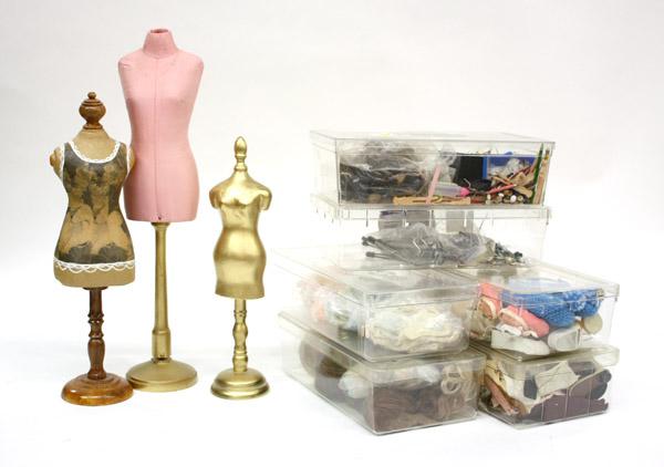 Seven containers with assorted doll clothes, shoes, accessories, and wigs; together with 3 doll dress forms