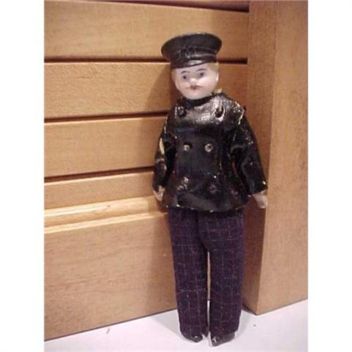 His painting is excellent and his uniform is adorable. There is nothing wrong with this doll. He appears to have a cloth body with bisque arms and legs. His molded bisque hat makes him rare. He has wool pants with a narrow plaid design in them. His jacked is oilcloth I think. It has some worn spots that a black marker would hide. He is really unique.