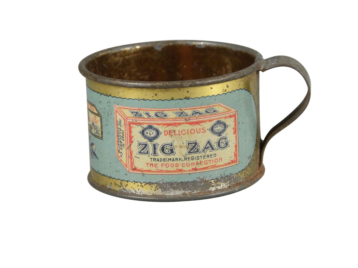 Doll's Tin Cup Advertising Two Varieties of Gum including Clark's Pepsin, Zig Zag. The D.L. Clark Company, Pittsburg, PA. USA. Some minor paint loss otherwise good condition. 1 inch tall.