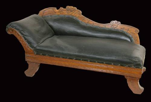Doll's fainting couch, Eastlake style, maple frame, leather upholstry, 32 inches long, 15 inches tall. Good Cond.