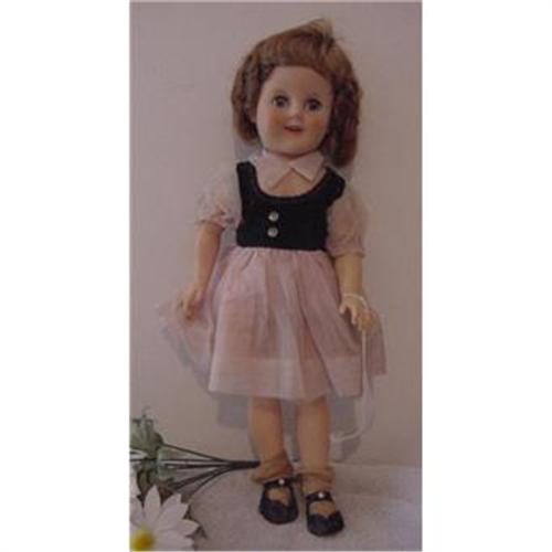17" vinyl umarked Shirley Temple doll. No dimples, eyes open and close. Original outfit, has been played with. Needs a good cleaning and freshening up. <P><P>Got questions, email before you bid.