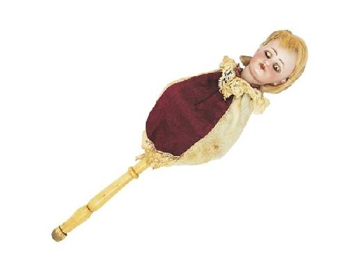 Colour painted porcelain head. Musical mechanism which can be switched on by an elliptical movement, whistle on the handle. Marked: HALBIG S & H., Germany, circa 1900 Size: 30 cm