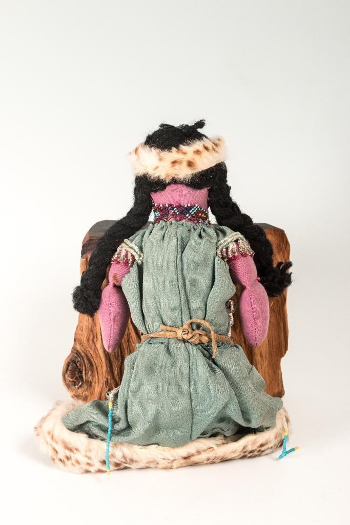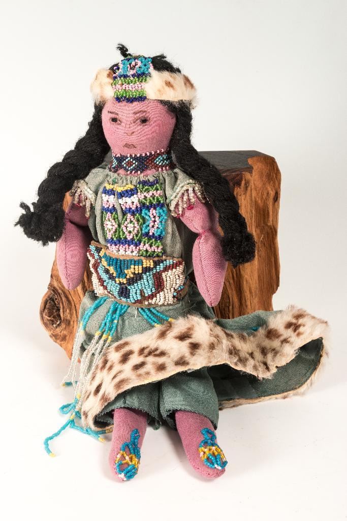 11" tall. Decorated with beads, fur, ribbon and felt. Circa 1890.
