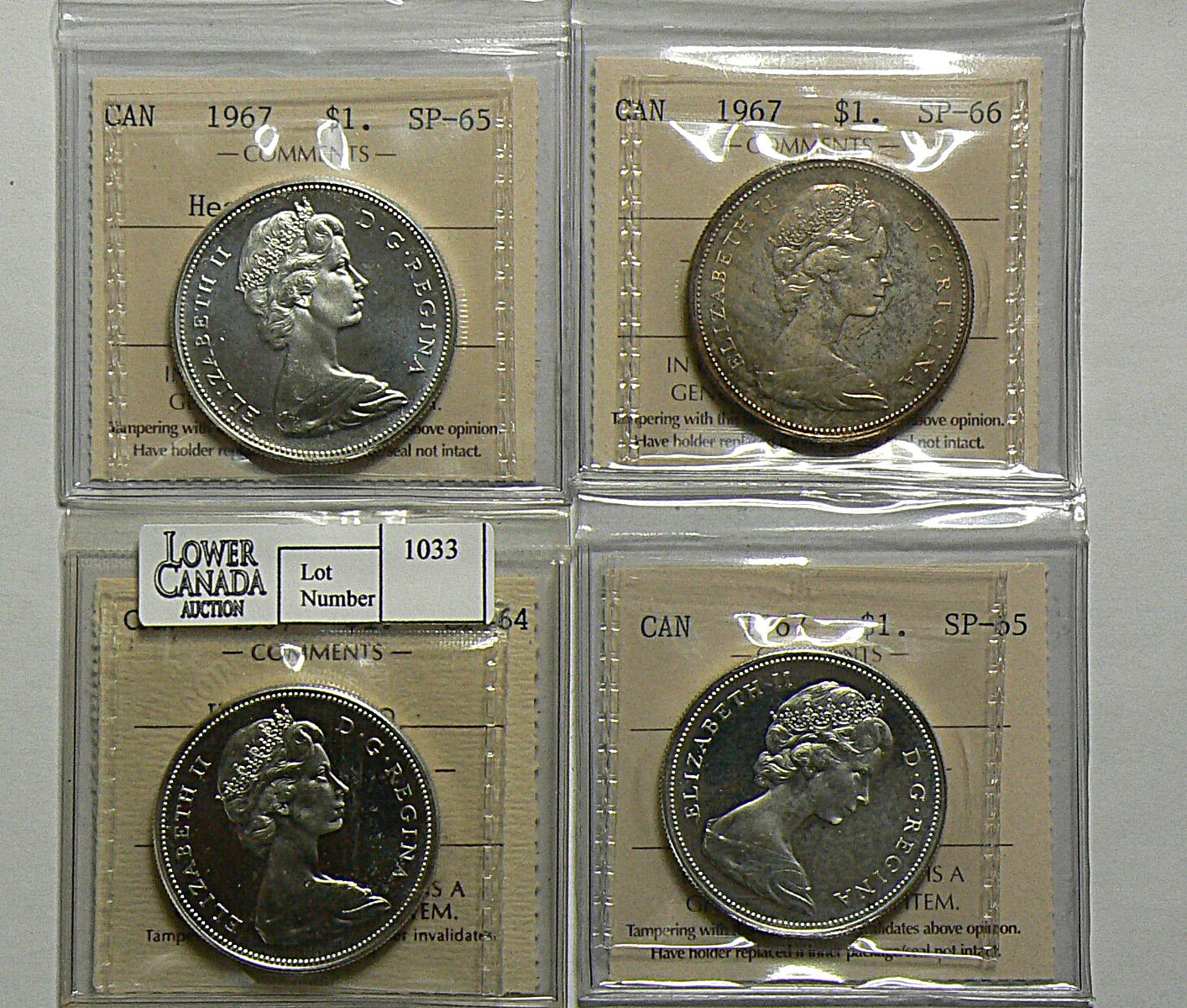 Dollar 1967 graded ICCS SP-64 Heavy Cameo, SP-65 Cameo, SP-65 Heavy Cameo, SP-66 Cameo. Lot of 4 coins.