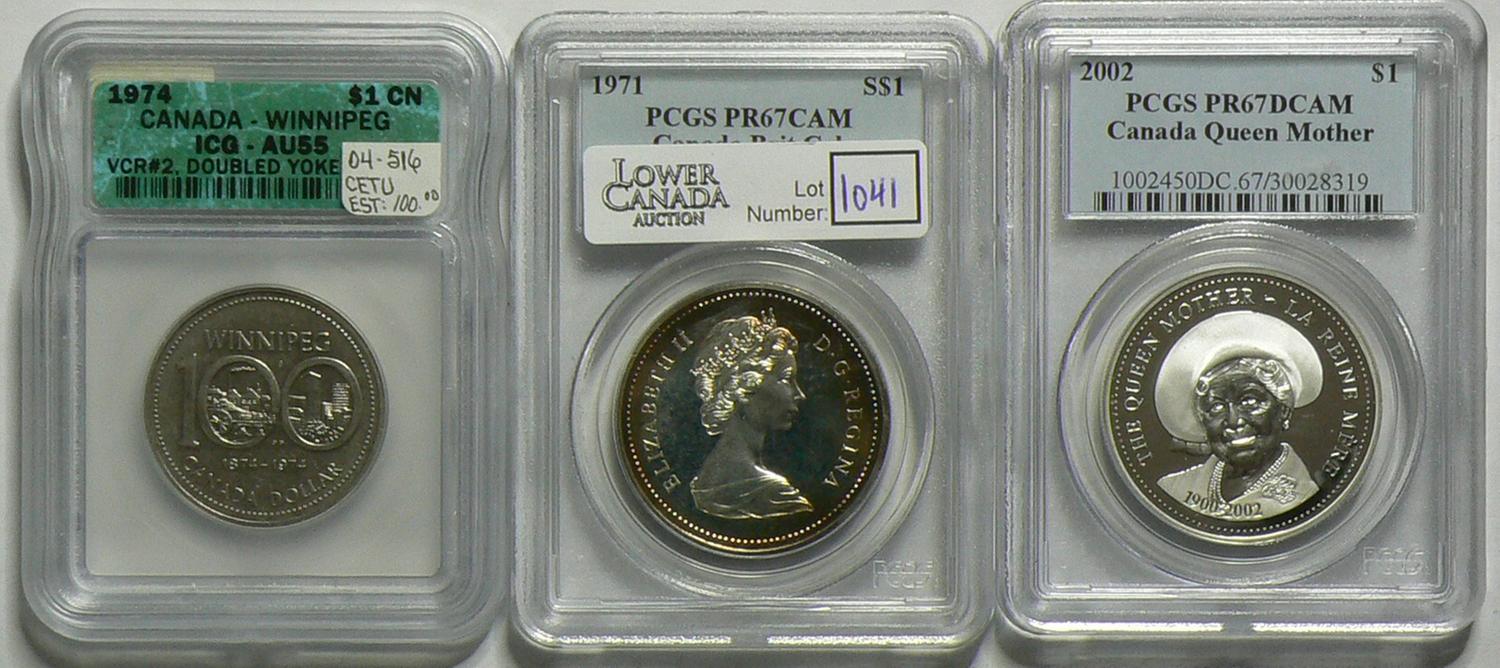 Dollar 1971 graded PCGS PR67 Cameo British Columbia - Silver - Nice Tone, 1974 graded ICG AU-55 Winnipeg Double Yoke, 2002 graded PCGS PR67 Deep Cameo Queen Mother. Lot of 3 coins.