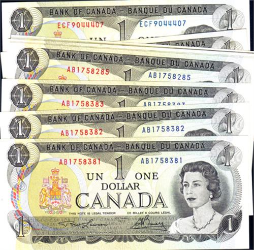 Bank of Canada One Dollar 1973, Lawson-Bouey, BC-46a, six notes with prefixes AB and One Dollar, Crow-Bouey, BC-46b, six notes BFB, BFF, ECA and ECF. Total of twelve notes, all Uncirculated