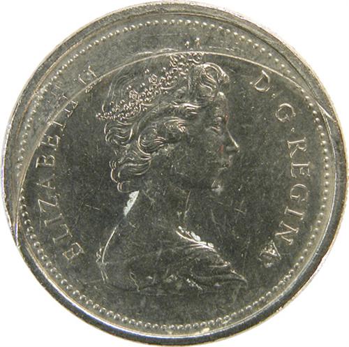 Canada Dollar 1976 Nickel, Struck on a Partially Clipped Planchet. An 85o clip would have resulted from this partial cut arching from 8 o’clock to 2 o’clock on the obverse and correspondingly, from 10 o’clock to 4 o’clock on the reverse, AU-Uncirculated