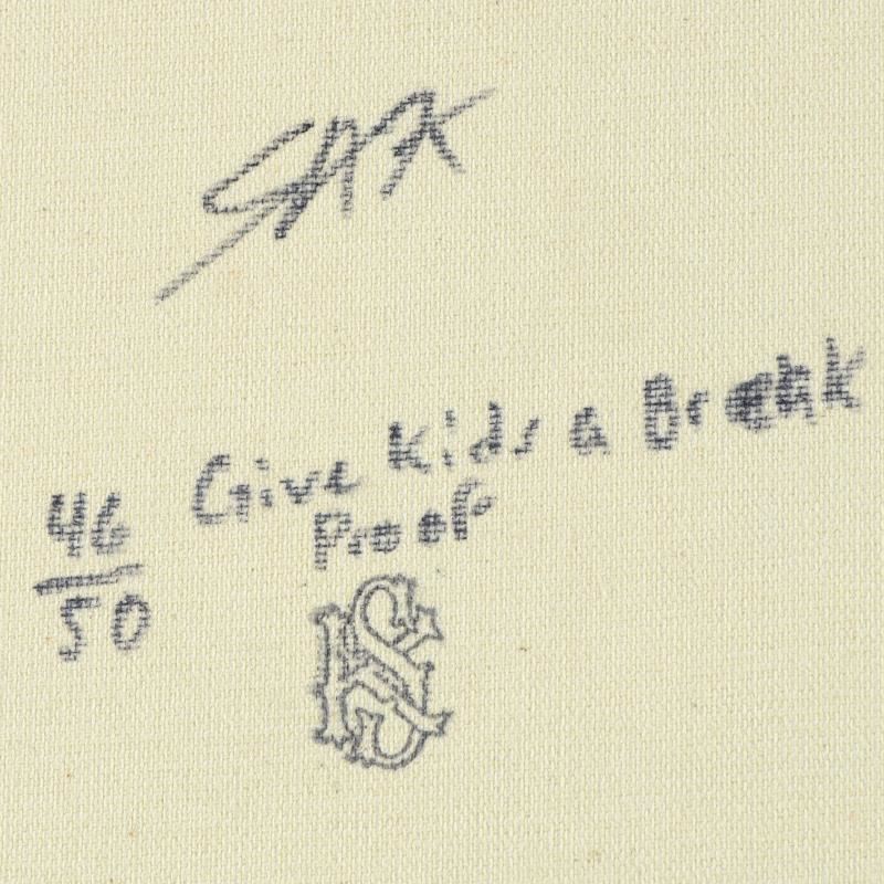 "Dollar Sign" is a limited edition hand pulled silkscreen on canvas by Andy Warhol protege Steve Kaufman (1960-2010). This piece is numbered 46/50 and hand signed inverso. Includes Certificate of authenticity. As is common with Kaufman's works, this piece may have perceived minor flaws, but is in overall good condition. Measures approx. 24" x 24" (image). Please note: there is minor smudging on the bottom right corner that may be concealed when stretched and framed.