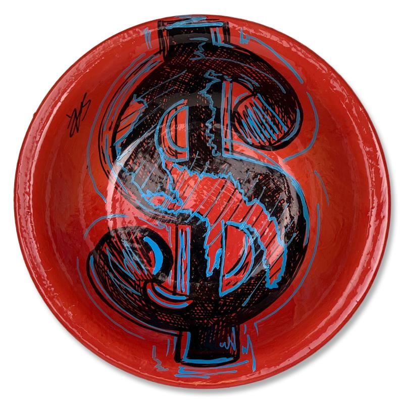 "Dollar Sign" is a hand painted plate by Steve Kaufman (1960-2010). This piece is hand signed by the artist and includes a letter of authenticity. As is common with Kaufman's works, this piece may have perceived minor flaws, but is in overall good condition. Measures approximately 7" (diameter).