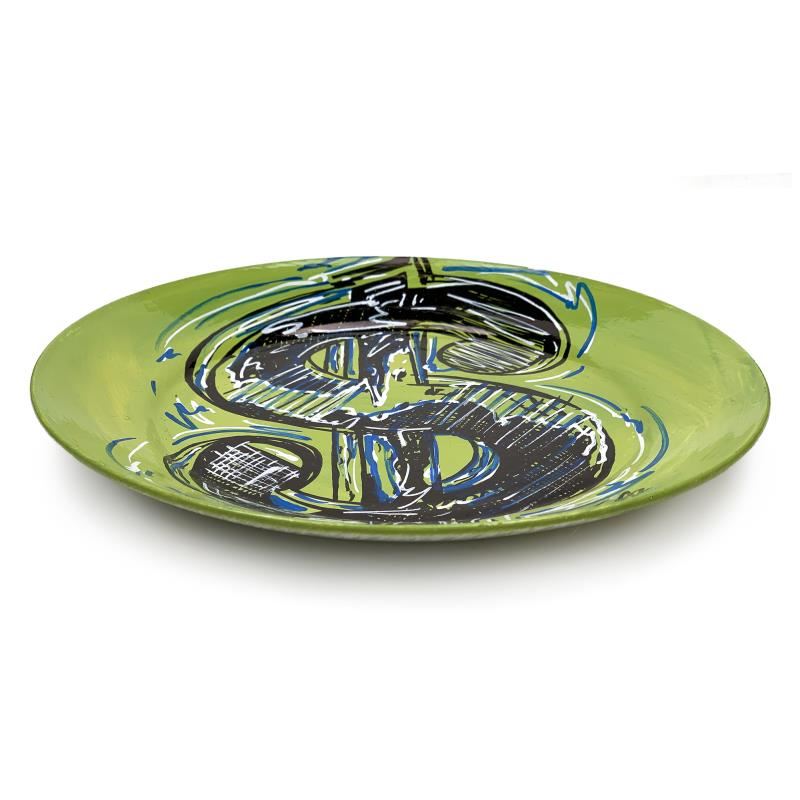 "Dollar Sign" is a hand painted plate by Steve Kaufman (1960-2010). This piece is hand signed by the artist and includes a letter of authenticity. As is common with Kaufman's works, this piece may have perceived minor flaws, but is in overall good condition. Measures approximately 8" (diameter).