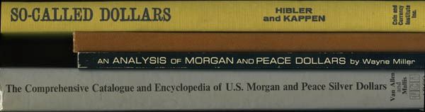Dollars, a group of 4 useful books, including The Comprehensive Catalog of U.S. Morgan and Peace Silver Dollars, by Van Allen and Mallis, 1976, hard bound, 316 pages, illustrated in black & white; An Analysis of Morgan and Peace Dollars, by Wayne Miller, 1976, paperback, 204 pages; The Fantastic 1804 Dollar, by Newman and Bressett, 1962, hard bound, 144 pages; and So-Called Dollars, by Hibler and Kappen, 1963, hard bound, 156 pages, very detailed and illustrated in black & white. All are in good condition. Shipping weight 7.2 lbs / 3.25 kilos. Estimate $60 - 80.