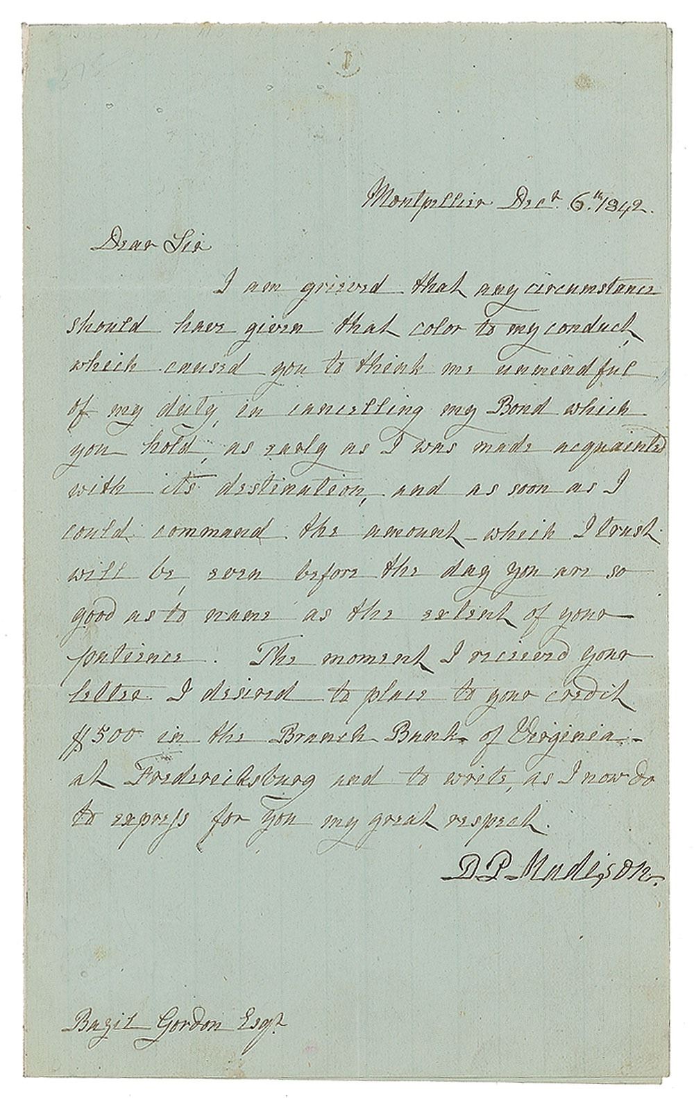 ALS signed “D. P. Madison,” one page, 4.75 x 8, December 6, 1842. Letter to Bagit Gordon, in part: "I am grieved that any circumstances should have given that color to my conduct which caused you to think me unmindful of my duty, in…my Bond which you hold…The moment I received your letter I desired to place your credit $500 in the Branch Bank of Virginia at Fredericksburg and to write, as I now do to express for you my great respect." In fine condition, with staple holes near the top edge.