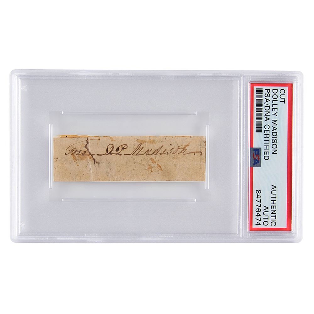 Ink signature, "Free, D. P. Madison,& rdquo; on an off-white 2.75 x .75 slip. In very good to fine condition, with light soiling and staining, and a tear passing through the word "Free." Encapsulated in a PSA/DNA authentication holder.