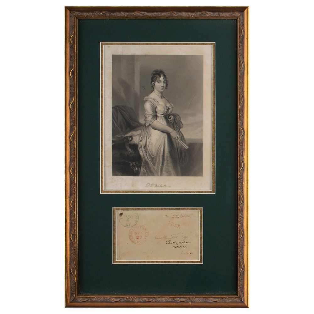 Desirable hand-addressed and free franked mailing panel, 5 x 3, addressed by Madison to "James M. Todd, Esqr., Frankfort, Kentucky," and franked in the upper right, "Free, D. P. Madison." Frankfort has been struck through and corrected to "Shelbyville" in another hand. Postmarked "Free" at Washington, November 29, [no year]. Double-matted and framed with an engraved portrait (bearing a facsimile signature) to an overall size of 11 x 18. In very good to fine condition, with light soiling and toning.