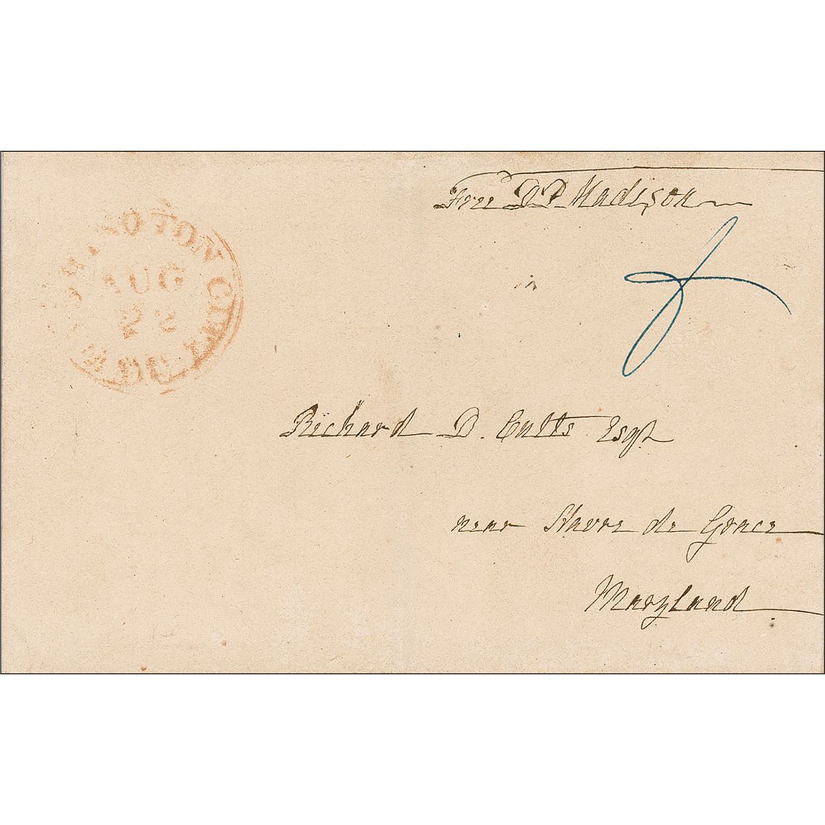 Uncommon hand-addressed full free frank, measuring 10 x 8 unfolded, with the address panel measuring 5 x 3, addressed in Madison’s hand to “Richard D. Cutts, Esq…Maryland,” and franked in the upper right, “Free D. P. Madison.” In very good condition, with a central vertical fold through the address panel, a uniform shade of toning with darker areas along the edges, some scattered light toning, an ink notation beneath the free frank, a section of paper loss to the top edge from the black wax seal, which is still very much intact. An uncommon free frank, addressed and signed with Madison’s exceptionally precise penmanship.