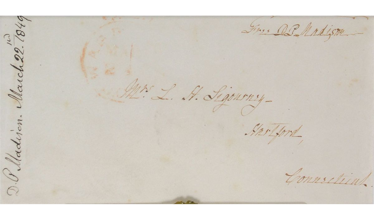 Scarce hand-addressed free frank, 5.25 x 3.75, addressed by Madison to “Mrs. L. H. Sigourney, Hartford, Connecticut,” and franked in the upper right, “Free, D. P. Madison.” Also bears docketing to the left side indicating a date of March 22, 1849, and the wax seal monogrammed “JM” displayed below. Nicely cloth-matted and framed with an image of the first lady to an overall size of 14.5 x 17.5. In fine condition, with some subtle foxing. The recipient, Lydia Huntley Sigourney, was a popular poet known as the ‘Sweet Singer of Hartford.’ Her friendship with Madison had begun long before; she had visited the Madisons at their farm in Virginia in 1825 and subsequently wrote the lyrical poem ‘Montpelier’ to thank them for their hospitality.